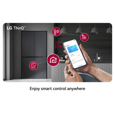 Smart Connectivity with LG ThinQ™ Live smarter and stay connected with the LG ThinQ™ app, which allows you to manage your refrigerator and receive updates from anywhere. A scenario showcases a woman using the app remotely, highlighting the convenience of modern technology in everyday life. (Availability of ThinQ functions may vary by country.)