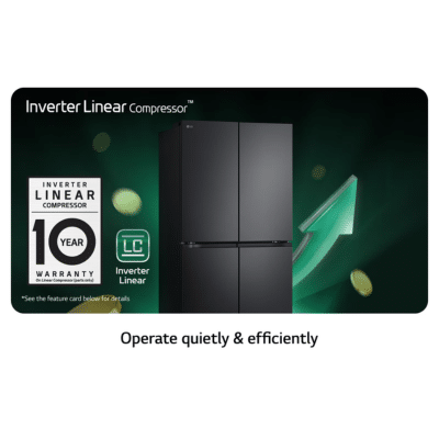 Efficient Cooling and Energy Savings The LG Inverter Linear Compressor™ not only maintains ideal temperatures more efficiently but also helps you save on energy. Enjoy a quieter, more durable refrigerator backed by a 10-year warranty on compressor parts. The compressor’s unique mechanism allows precise control, reducing friction points and energy consumption compared to traditional compressors. (Based on VDE testing.)